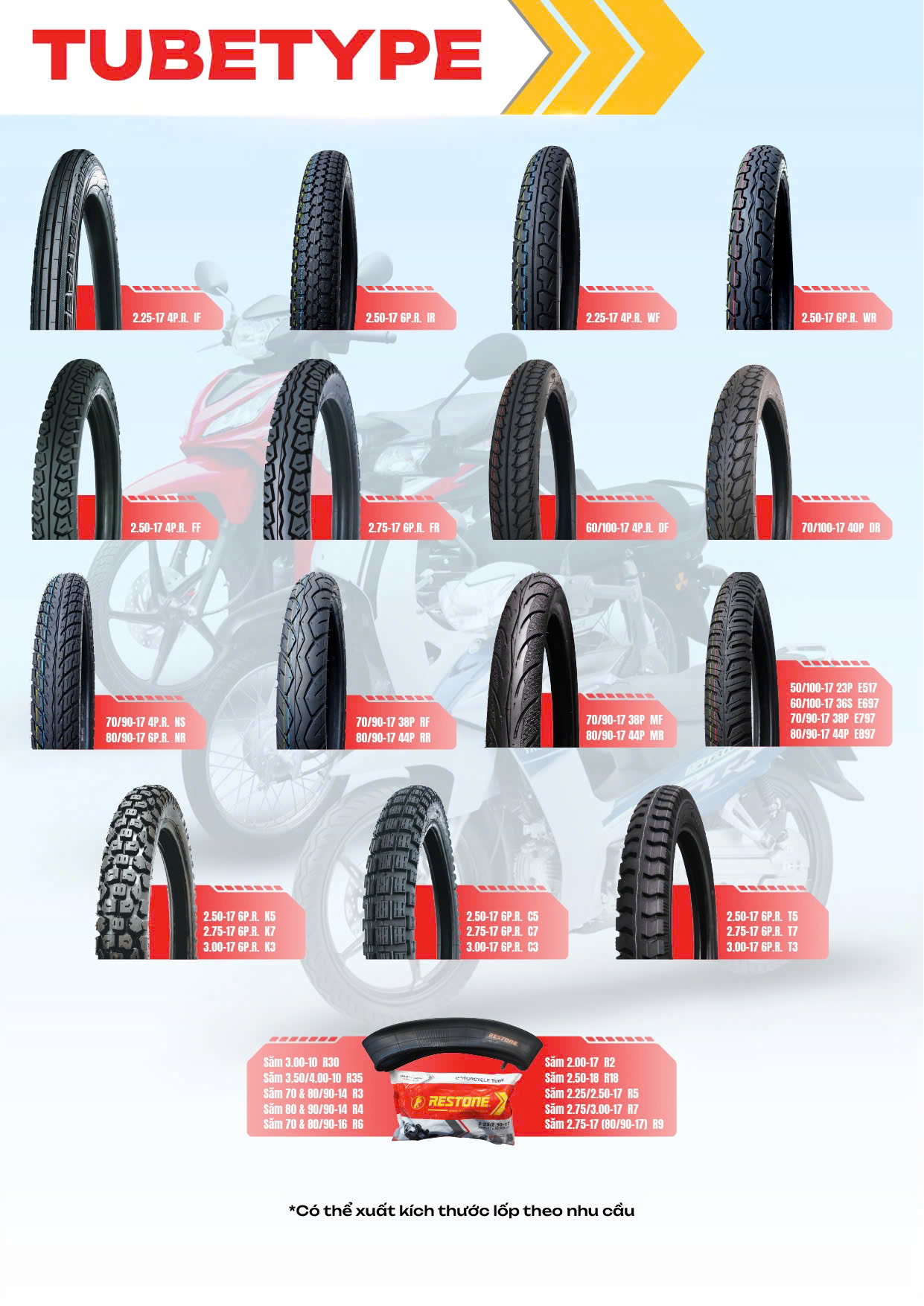| Săm 80 & 90/90-14 | R4 | Sau: Honda Click; Air Blade; Vison. |